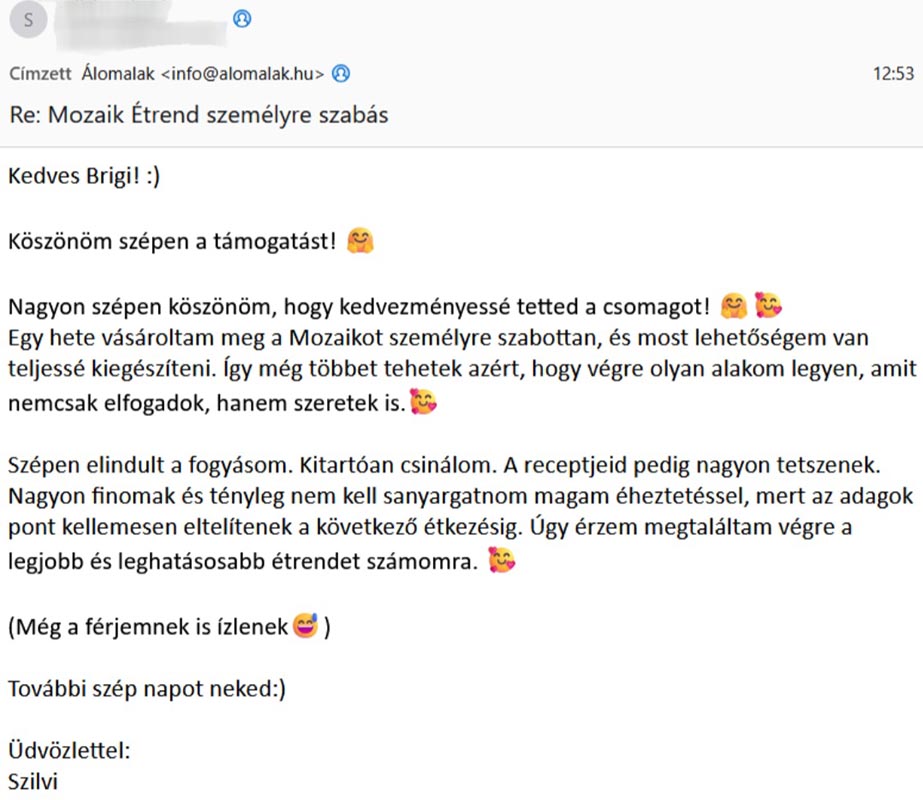 Személyre szabottan kiszámolom neked a számodra ideális kalóriamennyiséget, és összeírok rád szabott kombinációkat a Mozaik Étrendhez. Ezt egy űrlap kitöltése után, névre szólóan fogom neked elküldeni e-mailben.
